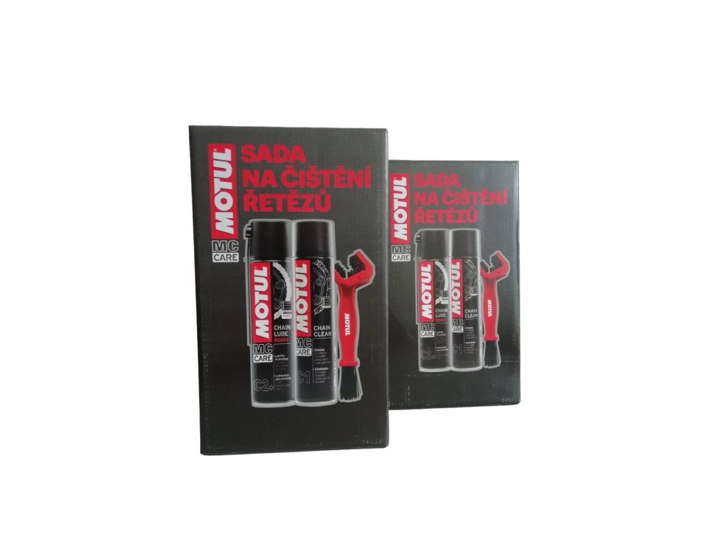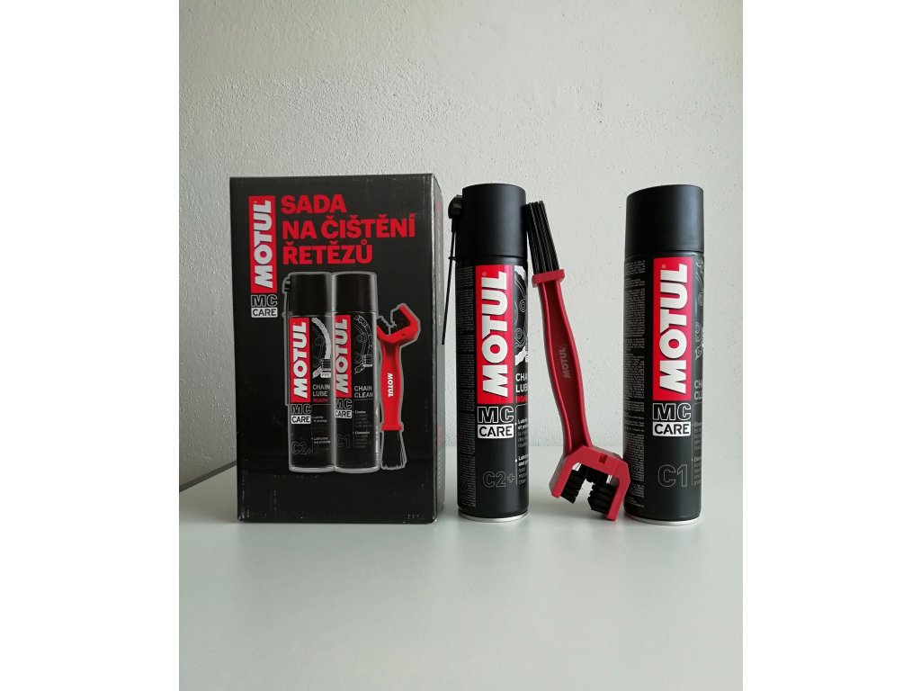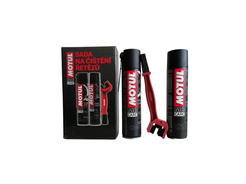 Sada obsahuje: Motul C1 čistič, Motul C2+ olej , Motul kartáč