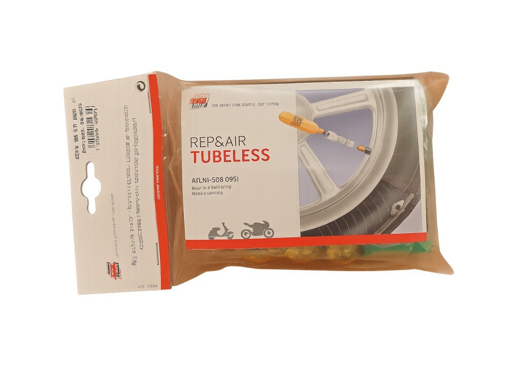 Lehká cestovní sada pro opravu bezdušových pneumatik na motocykl nebo skútr.